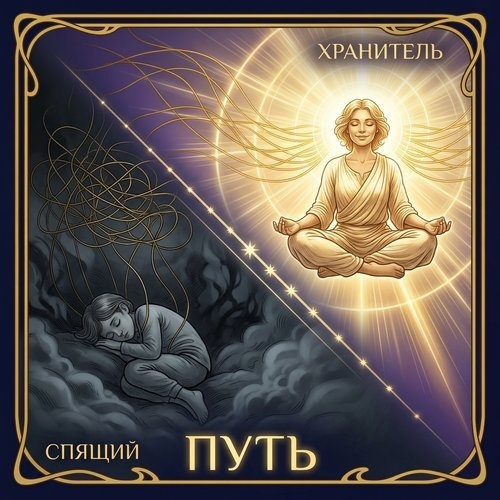Карта Таро в вертикальном формате 9:16. Тёмно-синий фон (#0A0E2A) с пурпурным градиентом. Двойная золотая рамка (#C8A84E) с орнаментом арт-нуво. Карта разделена по диагонали на две части. Нижняя левая часть — Спящий: фигура лежит свернувшись, глаза закрыты, вокруг — тьма, туман, неясные тени. Над фигурой — запутанные золотые нити (неосознанные мотивы), которые тянут её в разные стороны как марионетку, но она не видит их. Цветовая гамма — тёмные серо-синие тона, тусклые, холодные. Фигура маленькая, сжатая. Верхняя правая часть — Хранитель: фигура сидит в позе медитации, глаза открыты, спокойная улыбка. Вокруг — чистый золотой свет, расходящийся кругами. Те же золотые нити существуют — но они упорядочены, светятся и расходятся от фигуры как лучи солнца. Фигура не управляет нитями — она и есть источник. Цветовая гамма — тёплое золото, белый свет, сияние. Фигура большая, раскрытая, занимает пространство. На диагонали между ними — тонкая золотая линия-путь с двенадцатью маленькими точками-звёздами (12 ступеней), каждая следующая ярче предыдущей. Внизу слева мелким шрифтом «СПЯЩИЙ», вверху справа «ХРАНИТЕЛЬ», по центру внизу крупно «ПУТЬ» — всё золотыми заглавными буквами, шрифт с засечками, свечение. Гравюрная детализация, стиль арт-нуво, классическое Таро, цифровая живопись, высокая детализация. --ar 9:16 --v 6.1 --s 800