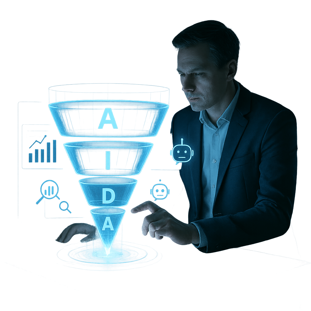 Чтобы построить эффективную воронку, нужно понимать, какой путь проходит клиент от первого знакомства с вами до покупки. Классическая маркетинговая модель AIDA идеально описывает этот процесс: