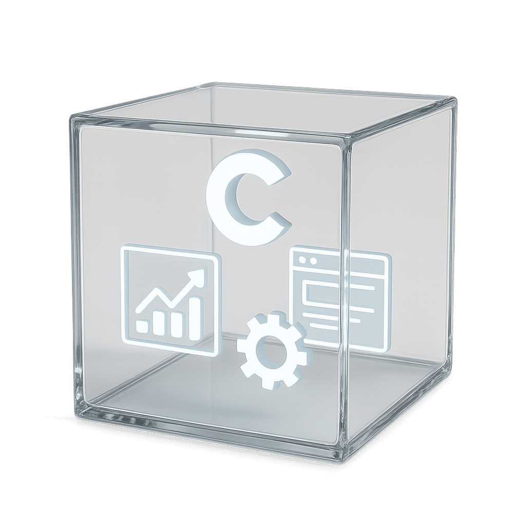 графический элемент в 3D без текста на прозрачном фоне, который визуализирует следующий текст. Концептуальная 3D-визуализация: прозрачный стеклянный куб, внутри которого собирается бизнес-проект. Внутри куба парят светящиеся элементы: логотип, график аналитики, иконка продающей страницы и шестеренки бизнес-процесса. Чистый белый фон, студийное освещение, высокая детализация, стиль продуктового рендера. --ar 16:9