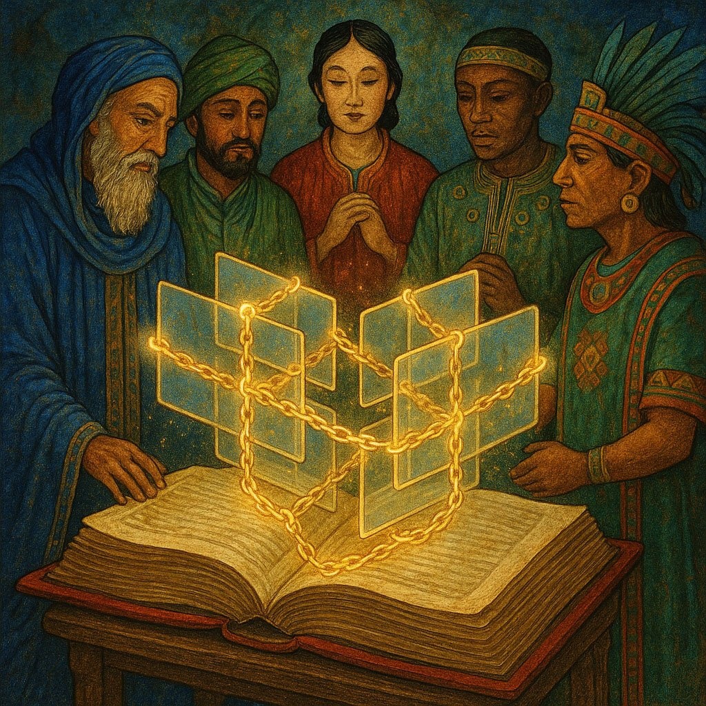 Промт: Древний фолиант, страницы которого состоят из полупрозрачных блоков, связанных между собой светящимися золотыми цепями. Вокруг него стоят люди разных эпох и культур, наблюдая за процессом. Атмосфера мудрости и коллективного доверия. Синие, красные, зеленые и золотые цвета. Стиль детализированной книжной иллюстрации, без футуризма. --ar 16:9