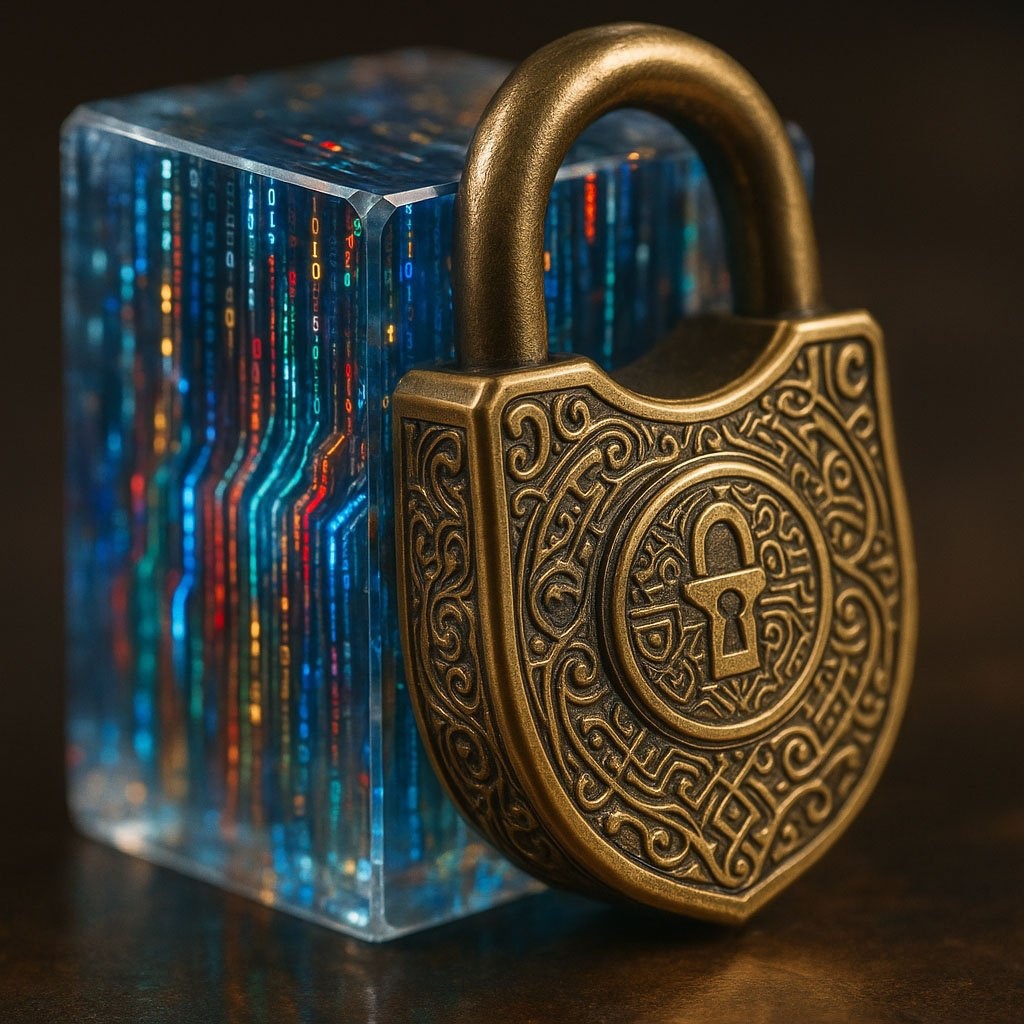 Промт: Кристаллический блок, наполненный потоками цифровой информации, в момент, когда его запирает невероятно сложный механический замок из латуни. Замок украшен сложной гравировкой, символизирующей криптографию. Мягкое, естественное освещение. Синие, красные, зеленые и золотые цвета в потоках данных и деталях замка. Макросъемка, высокая детализация. --ar 16:9