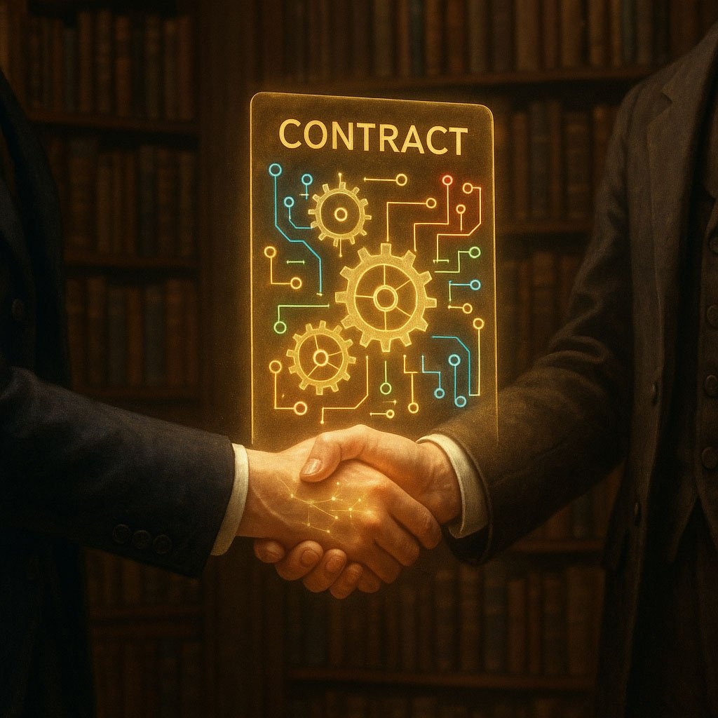 Промт: Два человека в классической одежде заключают рукопожатие. Между их ладонями формируется полупрозрачный золотой контракт, состоящий из тонких шестеренок и светящихся логических схем. Символ автоматического и нерушимого соглашения. Фон — старинная библиотека. Синие, красные, зеленые и золотые цвета в схемах контракта. Реалистичный стиль, мягкий свет. --ar 16:9