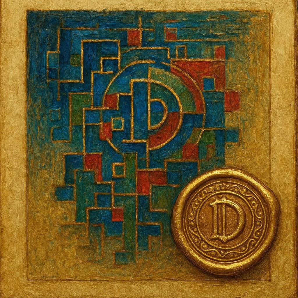 Промпт: Старинный цифровой манускрипт, на котором изображено абстрактное цифровое искусство. В углу картины стоит большая, богато украшенная золотая печать с уникальным символом, символизирующая право собственности. Изображение и печать выполнены в палитре из синего, красного, зеленого и золотого цветов. Стиль масляной живописи, высокая детализация, текстурированный фон. --ar 16:9