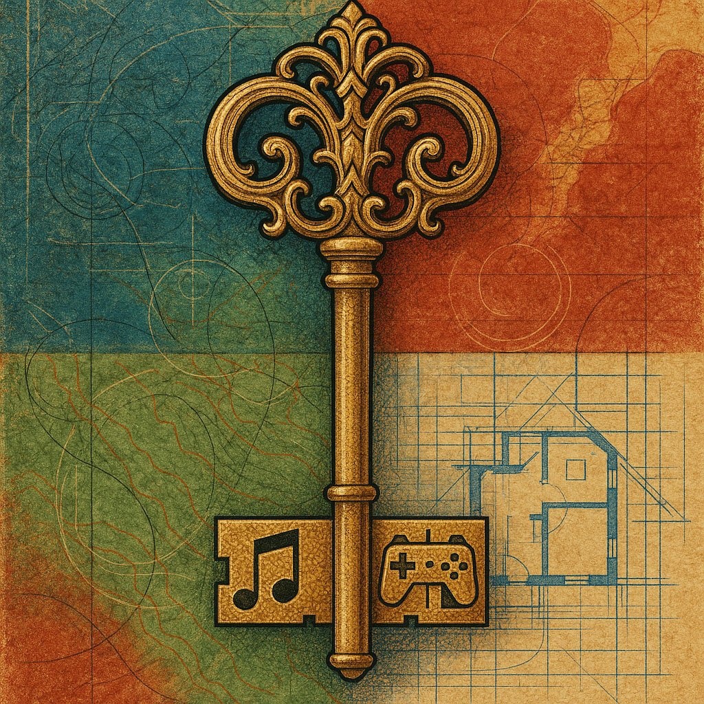 Промпт: Концептуальное искусство: в центре большой, богато украшенный ключ. На его зубцах выгравированы символы: нота, джойстик и план дома. Фон — коллаж из текстур, напоминающих холст, карту и чертеж. Палитра из синих, красных, зеленых и золотых цветов объединяет композицию. Стиль книжной иллюстрации, высокая детализация. --ar 16:9