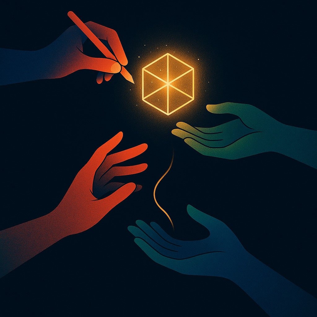 Промпт: Символическая композиция: рука художника создает цифровой объект. Другие руки передают этот светящийся объект друг другу по цепочке. От последней сделки к руке художника тянется тонкий золотой поток. Цветовая палитра из синих, красных, зеленых и золотых цветов. Минимализм, студийное освещение, высокая контрастность. --ar 16:9