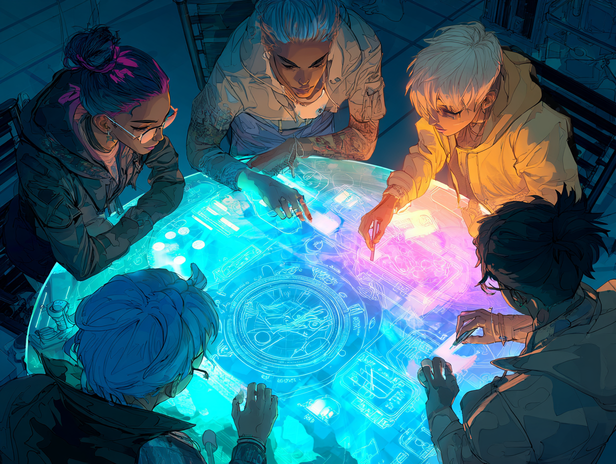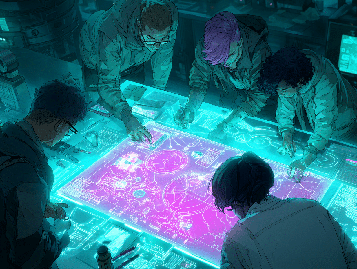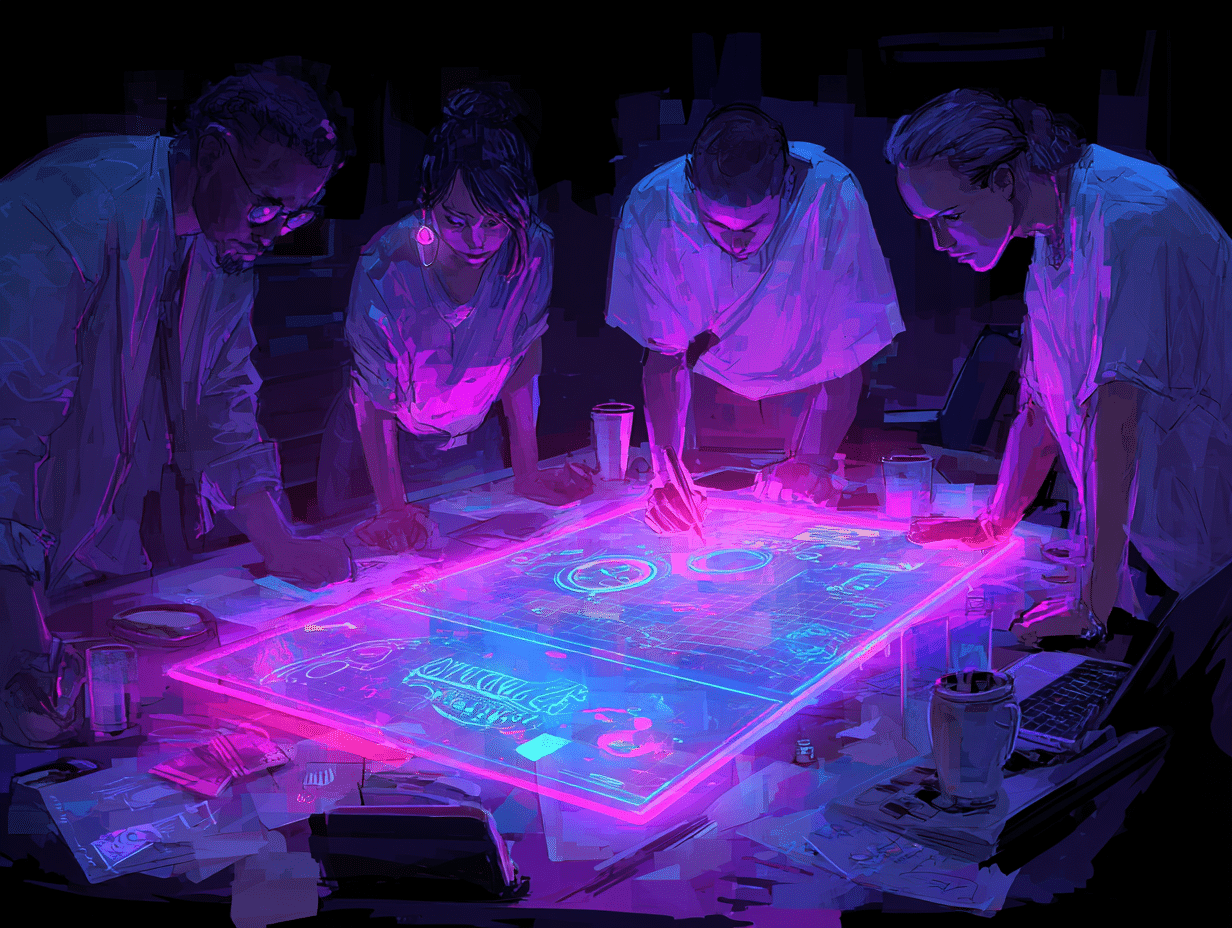 Концепт-арт: команда стратегов и дизайнеров склонилась над светящимся столом, на котором проецируется голографический чертеж бренда. Видны элементы: логотип в разработке, цветовая палитра, диаграммы целевой аудитории и ключевые слова миссии. Атмосфера мозгового штурма и создания чего-то нового. Неоновое свечение, киберпанк-эстетика, высокая детализация. --ar 4:3