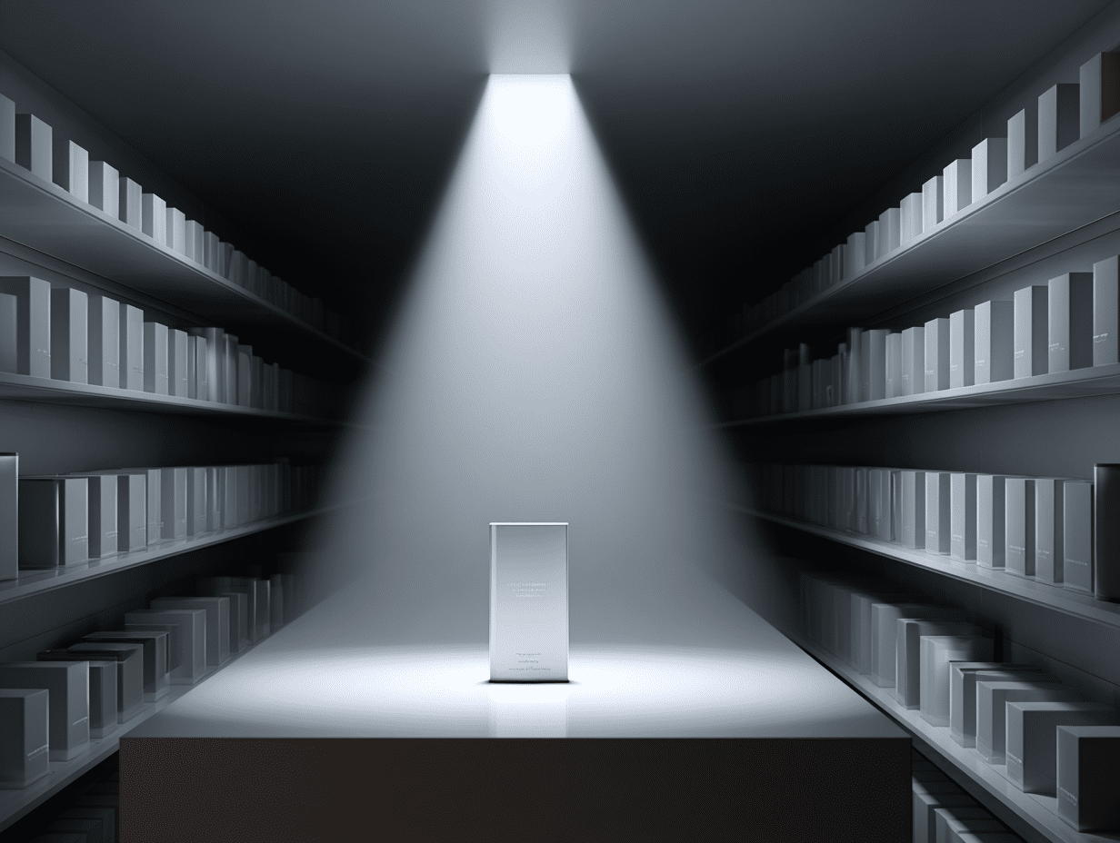 Photorealistic image: a shelf in a minimalist store, filled with faceless gray boxes. In the very center, under a bright beam of light, stands a single product in perfectly designed, impressive, and stylish packaging. Emphasis on design, materials, and typography. Shallow depth of field, studio lighting, commercial photography. --ar 4:3