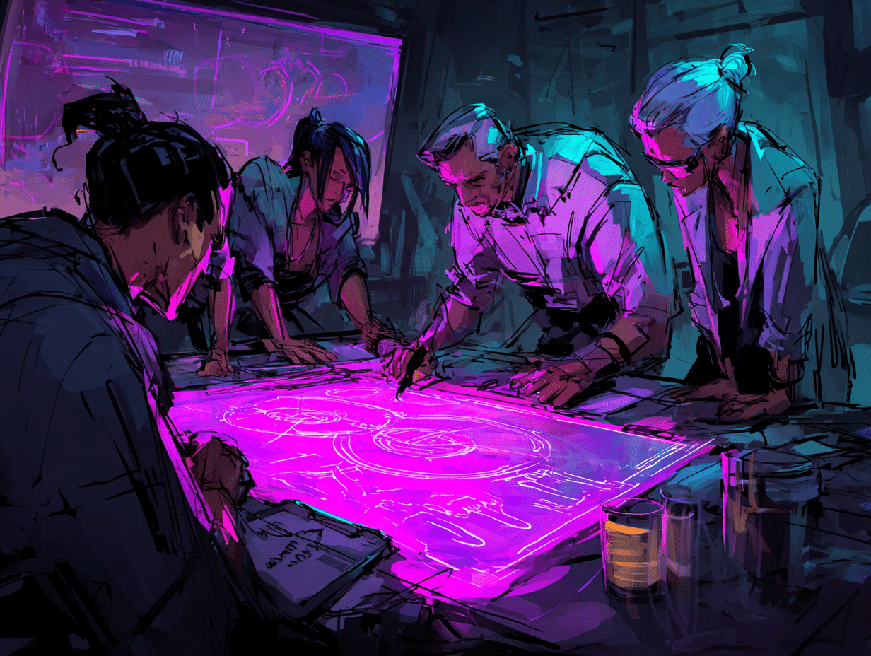 Concept art: a team of strategists and designers leaning over a luminous table, on which a holographic blueprint of a brand is projected. Elements are visible: a logo in development, a color palette, target audience diagrams, and mission keywords. An atmosphere of brainstorming and creating something new. Neon glow, cyberpunk aesthetic, high detail. --ar 4:3