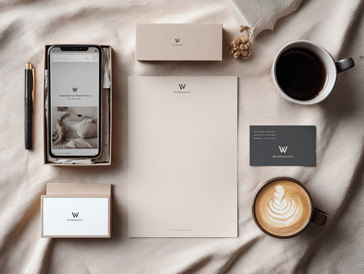Композиция в стиле флэт-лей: на текстурном фоне гармонично расположены элементы упакованного бизнеса. В центре — физический продукт в красивой коробке, рядом смартфон с открытым сайтом бренда, стильная визитка, чашка кофе с логотипом и фирменная полиграфия. Все объекты выполнены в едином фирменном стиле, цветах и материалах. Мягкий дневной свет, вид сверху, чистота и порядок. --ar 4:3