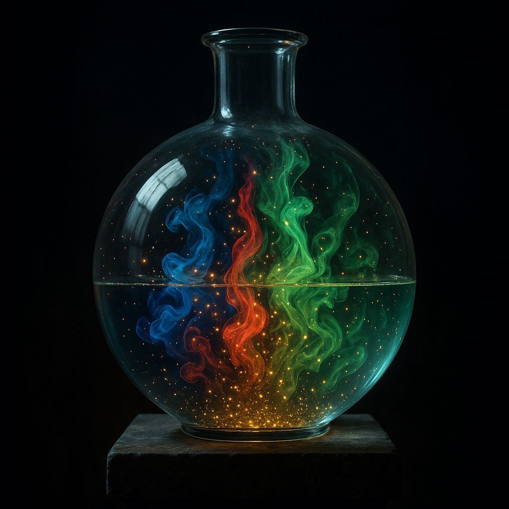 Большой сферический стеклянный сосуд, как у алхимика, стоит на каменном постаменте в темной комнате. Внутри сосуда в прозрачной жидкости медленно и грациозно смешиваются густые потоки света, похожие на чернила в воде. Потоки света — синие, красные, зеленые, и в них вспыхивают и кружатся мириады сверкающих золотых частиц. Минималистично, фокус на сосуде, высочайшая детализация жидкости и света, ощущение магии и контроля, фотореалистичная 8К визуализация. --ar 16:9 --style raw --v 6.0