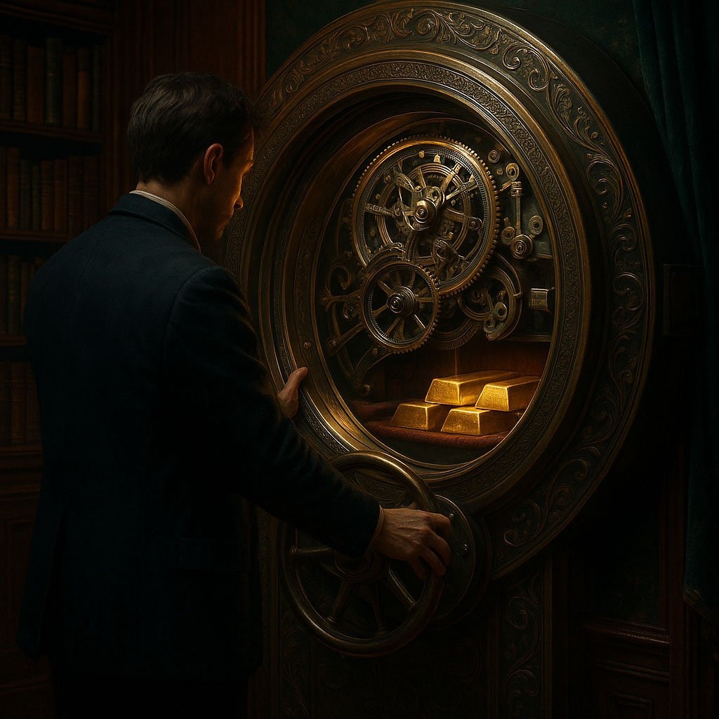 Человек взаимодействует с массивной круглой дверью старинного банковского сейфа, покрытой сложными гравировками. Через толстое стеклянное окно в двери виден безупречно работающий часовой механизм из множества шестеренок и рычагов. Внутри сейфа на бархатных полках лежат светящиеся золотые слитки. Атмосфера старой частной библиотеки, приглушенное, теплое кинематографическое освещение. Палитра из глубоких синих, насыщенных красных, изумрудно-зеленых и сияющих золотых цветов. Высокое разрешение, реализм. --ar 16:9 --style raw --v 6.0