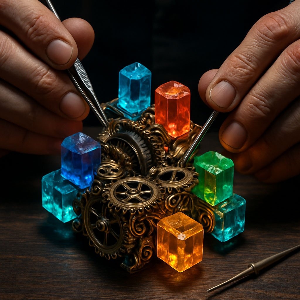 Руки мастера в перчатках собирают сложную механическую сферу из отдельных светящихся блоков. Блоки разных форм и цветов — синие, красные, зеленые — соединяются с центральным золотым ядром. Процесс сборки, студийный свет, гипердетализация, эстетика часового мастерства. --ar 16:9 --style raw --v 6.0