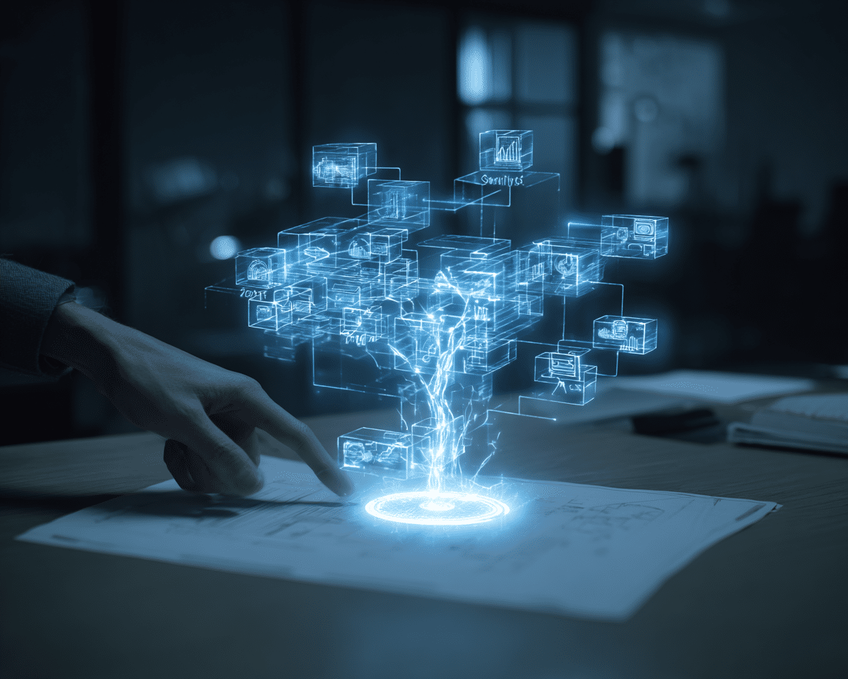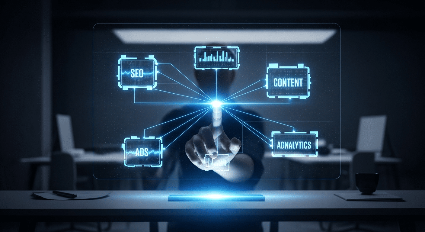 Голографический чертеж комплексной маркетинговой стратегии, парящий над столом в темном офисе. На чертеже видны блоки с надписями SEO, Content, Ads, Analytics, соединенные светящимися линиями в единую систему. Рука человека указывает на центральный узел, где сходятся все потоки. Стиль "Железного человека", футуризм, высокая детализация, синее свечение. --ar 5:4