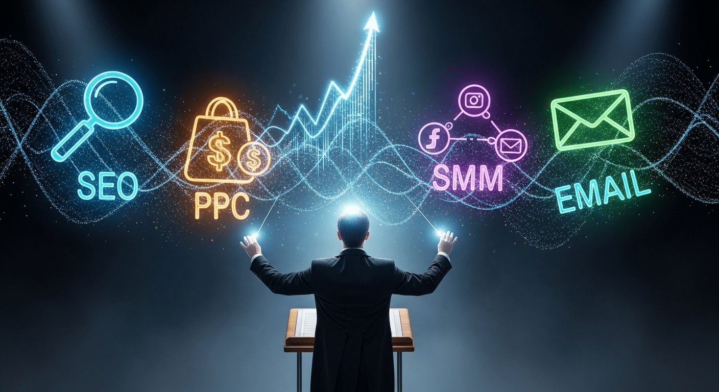 Дирижер в строгом костюме стоит спиной к зрителю и управляет оркестром из парящих в воздухе светящихся иконок: SEO, PPC, SMM, Email. Иконки движутся в гармонии, создавая волны света и данных, которые сливаются в единый восходящий график. Темный фон, кинематографическое освещение, высокая детализация, метафорическая концепция. --ar 5:4
