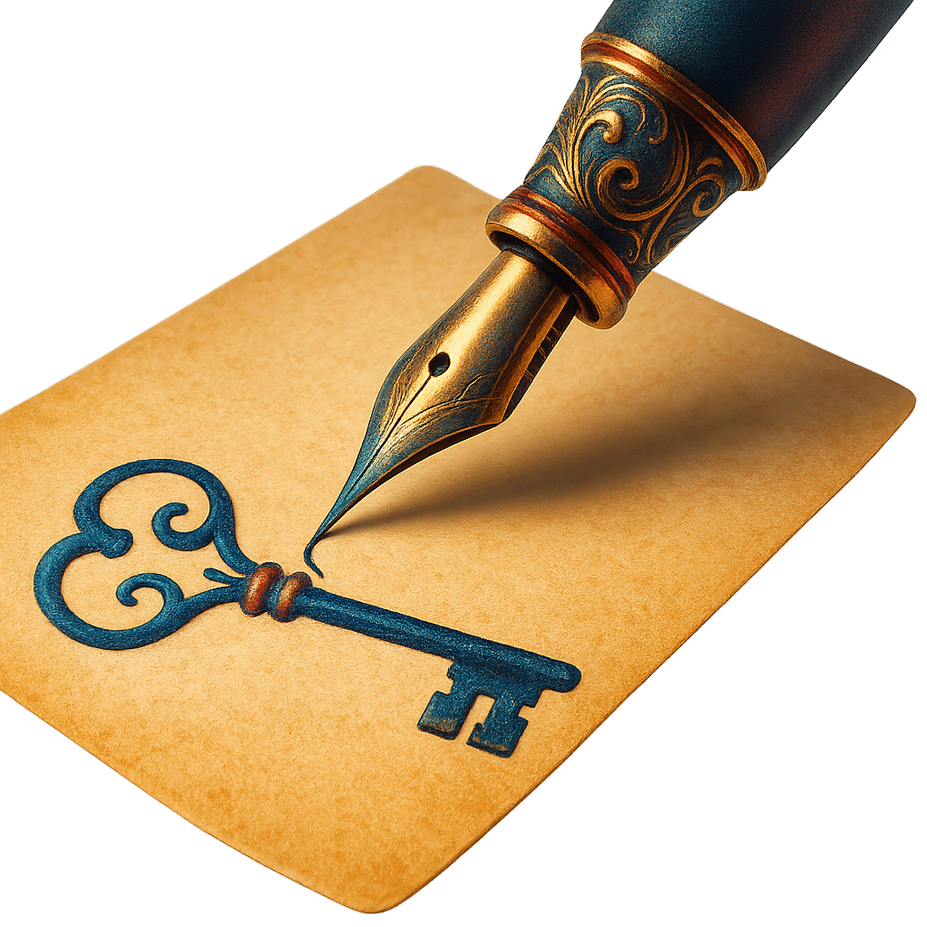 Промт: Макросъемка: старинная перьевая ручка пишет слово "УБЕЖДЕНИЕ" на листе пергамента. Чернильный след от пера плавно превращается в витиеватый старинный ключ, символизирующий доступ к умам клиентов. Элегантная композиция, богатые текстуры. Синие, красные, зеленые и золотые цвета. --no futuristic, neon, trees