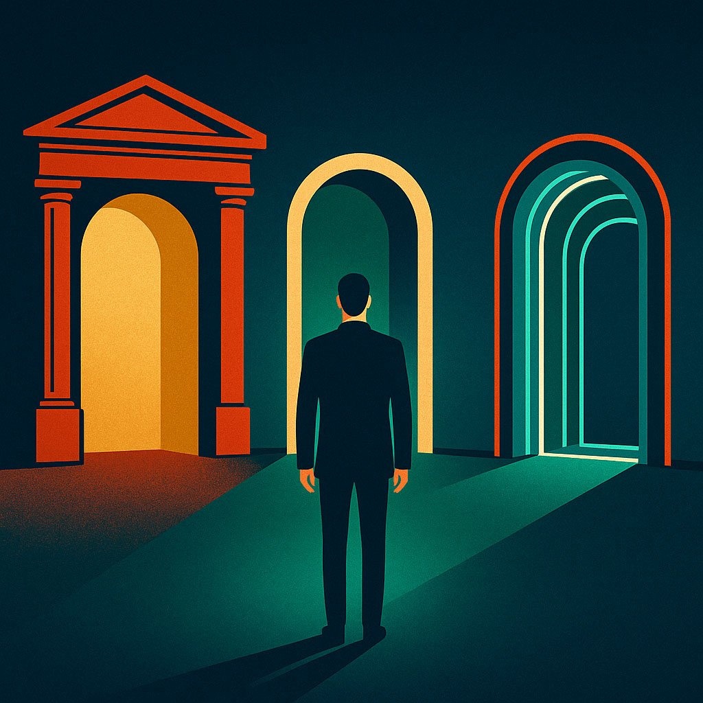 Человек в строгой одежде стоит в центре зала перед тремя арками разного стиля. Одна арка — монументальная, как вход в банк, вторая — простая и открытая, третья — выглядит как персональный высокотехнологичный шлюз. Концептуальное искусство, символизм выбора. Цветовая палитра состоит из глубоких синих, акцентных красных, зеленых и сияющих золотых цветов. Стилизованная графика, чистые линии, минимализм. --ar 16:9 --v 6.0