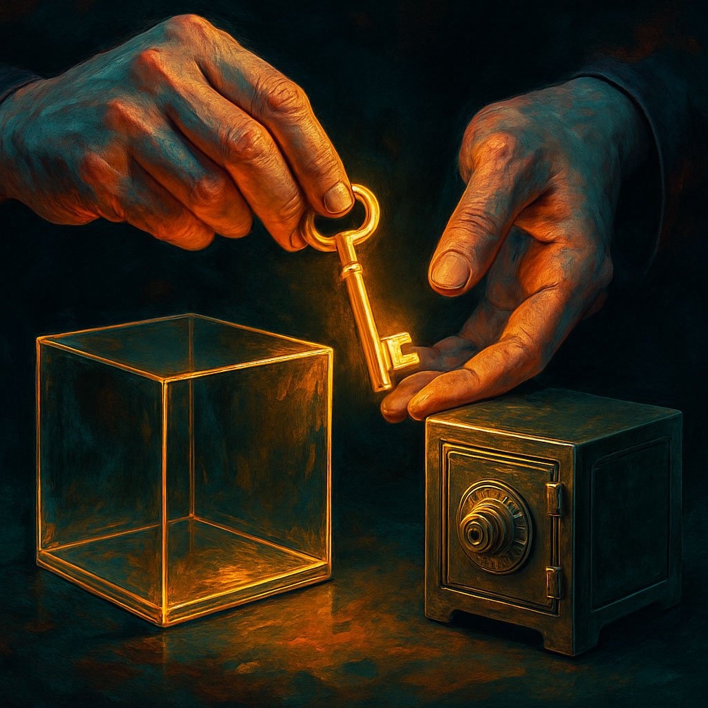 Руки человека осторожно перемещают сияющий золотой ключ из большого открытого стеклянного куба в маленький, прочный металлический сейф с гравировкой. Концептуальный образ безопасности и личного контроля. Макросъемка с высокой детализацией. Палитра из темных синих, контрастных красных, изумрудно-зеленых и ярких золотых цветов. Цифровая живопись, фокус на руках и объектах. --ar 16:9 --v 6.0