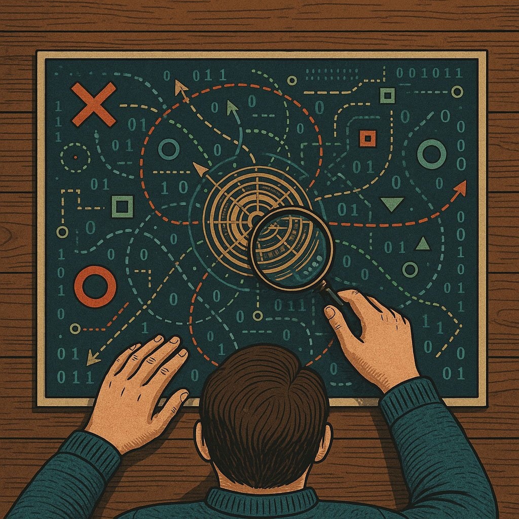 Вид сверху на стол, где человек с помощью лупы изучает сложную абстрактную карту с цифровыми символами. Инфографика, смешанная с гравюрой. Основные цвета — синий, красный, зеленый и золотой. Изображение исследования и стратегии.
