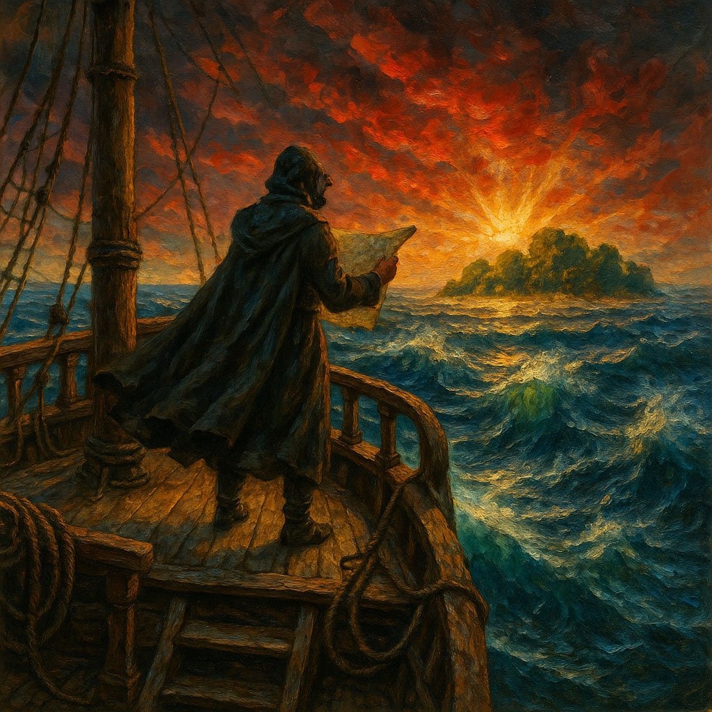 Текст промта: Человек в плаще стоит на палубе старинного деревянного корабля и смотрит на карту в бурном море. Огромные волны. Вдалеке виден спокойный остров, залитый светом. Эпическая сцена, стиль масляной живописи, высокая детализация. Палитра: глубокие синие волны, драматичные красные закатные облака, изумрудно-зеленые деревья на острове и сияющие золотые лучи света.