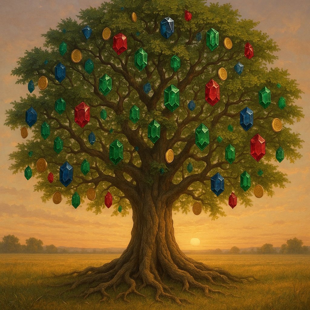 Текст промта: Могучее ветвистое дерево с мощными корнями стоит посреди поля на рассвете. Вместо обычных плодов на его ветвях растут монеты и кристаллы: синие сапфиры, красные рубины, зеленые изумруды и сияющие золотые монеты. Символ роста, терпения и диверсификации. Спокойная и величественная атмосфера, детальная иллюстрация в стиле фэнтези-реализма.