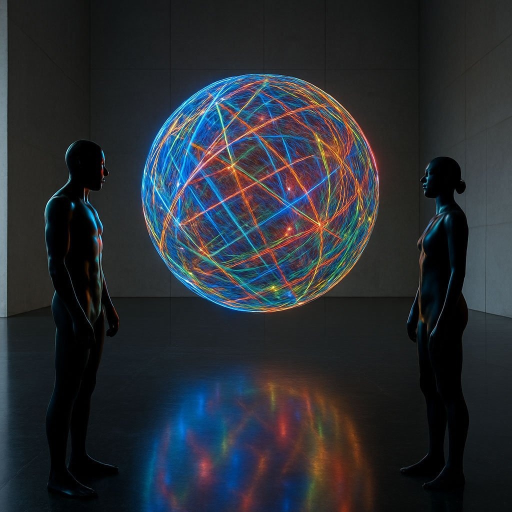 На русском: Два аватара, один мужской и один женский, стоят друг напротив друга в огромном, пустом зале с полом, похожим на гладкий обсидиан. Между ними в воздухе висит большая, медленно вращающаяся сфера, сотканная из энергетических нитей. Стиль современная скульптура, галерейное пространство. Нити сферы окрашены в яркие синие, красные, зеленые и золотые цвета, и их свет отражается на фигурах аватаров. --ar 16:9 --style raw
