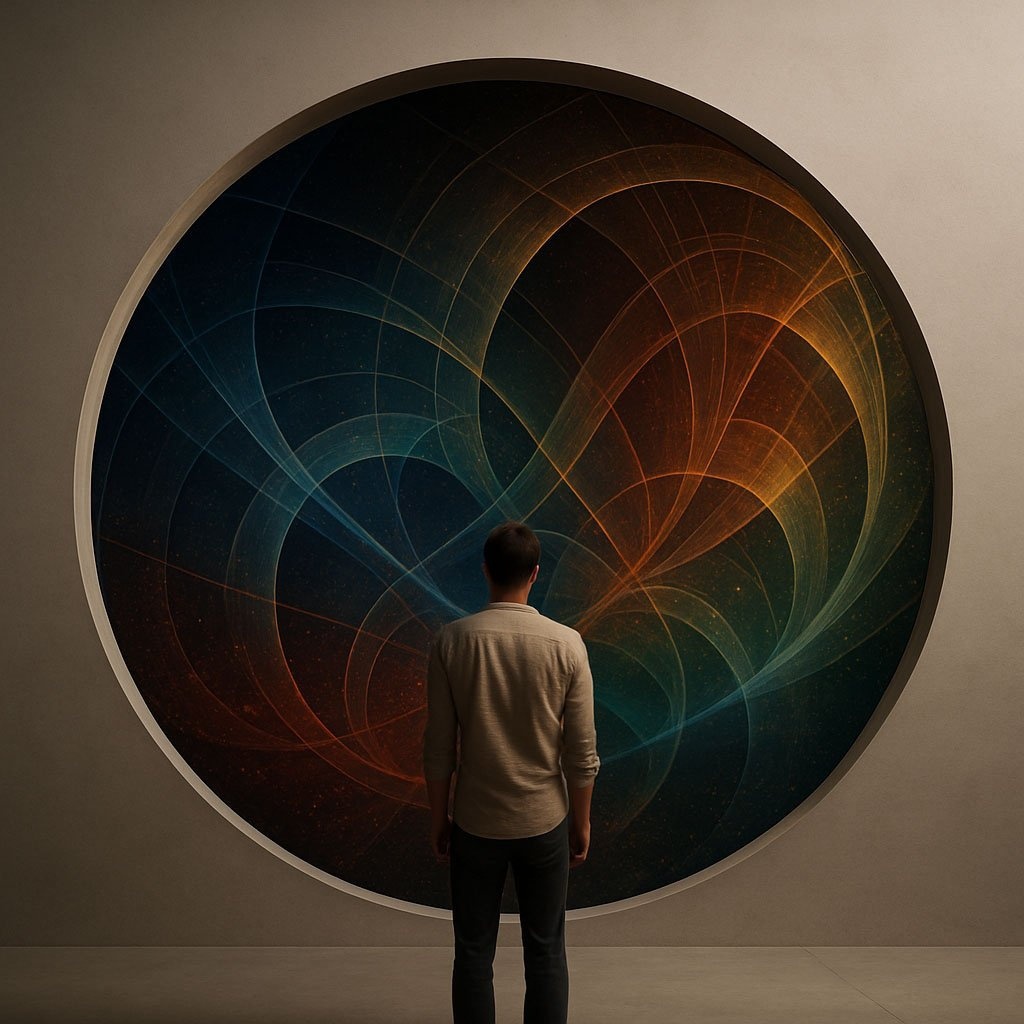 На русском: Человек в простой одежде стоит перед огромным круглым проемом в стене, за которым видно абстрактное пространство, состоящее из переплетающихся геометрических узоров и потоков частиц. Фотореалистичный стиль, минимализм, мягкое студийное освещение. Основная палитра пространства за проемом — синие, красные, зеленые и золотые цвета. --ar 16:9 --style raw