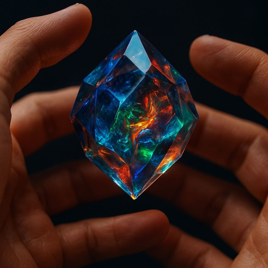 На русском: Макро-съемка: руки человека осторожно держат небольшой, парящий в воздухе кристалл сложной формы. Внутри кристалла видно замысловатое свечение и структуры. Мягкий, сфокусированный свет исходит от самого кристалла, освещая руки. Темный, нейтральный фон. Кристалл переливается, используя глубокие синие, красные, зеленые и золотые цвета. --ar 16:9 --style raw