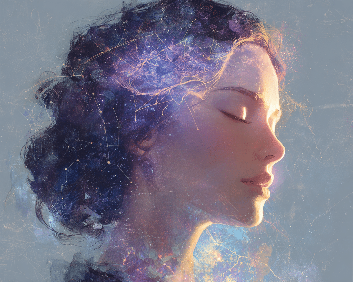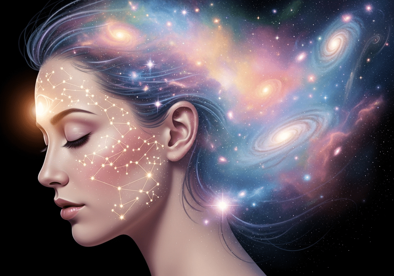 Лицо женщины в профиль с закрытыми глазами, полное умиротворения. Её волосы плавно переходят в космическую туманность, а на коже проступают светящиеся узоры созвездий. В области третьего глаза — мягкое сияние. Символизм, слияние человека и вселенной, гармония, эфирный стиль, пастельные тона с яркими акцентами, цифровая живопись. --ar 5:4
