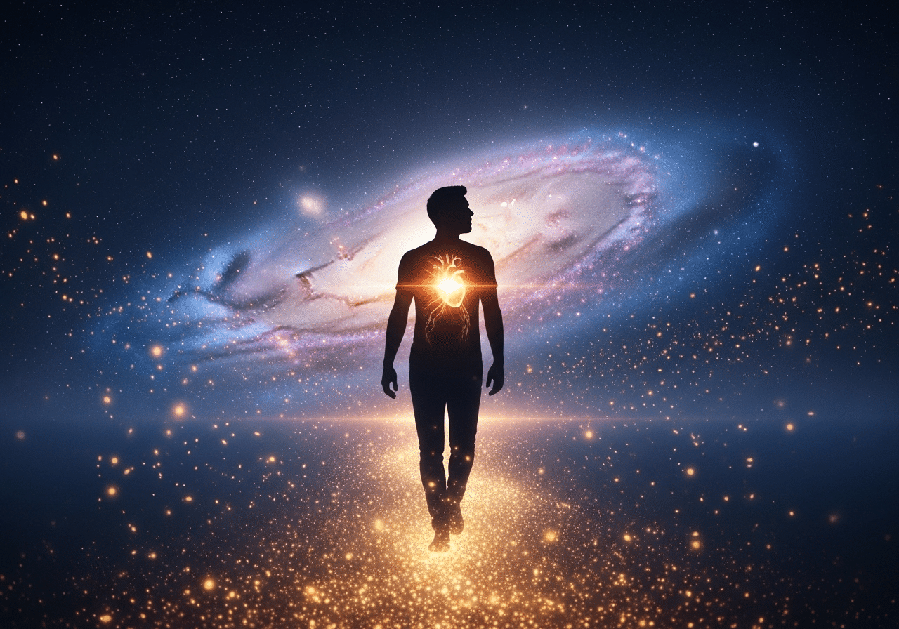 Силуэт человека, идущего по светящейся тропе к центру галактики. Внутри силуэта, в области сердца, горит яркий свет — символ души и самопознания. Вокруг парят светящиеся частицы. Кинематографичный кадр, магический реализм, глубокие синие и фиолетовые тона с золотыми искрами, высокая детализация