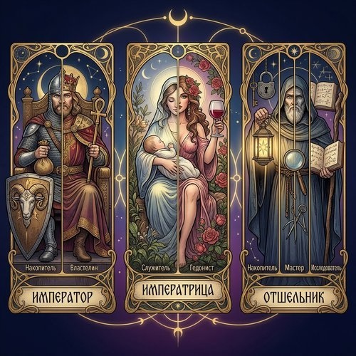 Общий архетип: Защитник границ. И Император, и Отшельник, и Накопитель объединены одним глубинным мотивом — создать пространство, где мир предсказуем и безопасен. Разница в том, что Император делает это через власть над территорией, Отшельник — через уход, а Накопитель — через ресурсы.