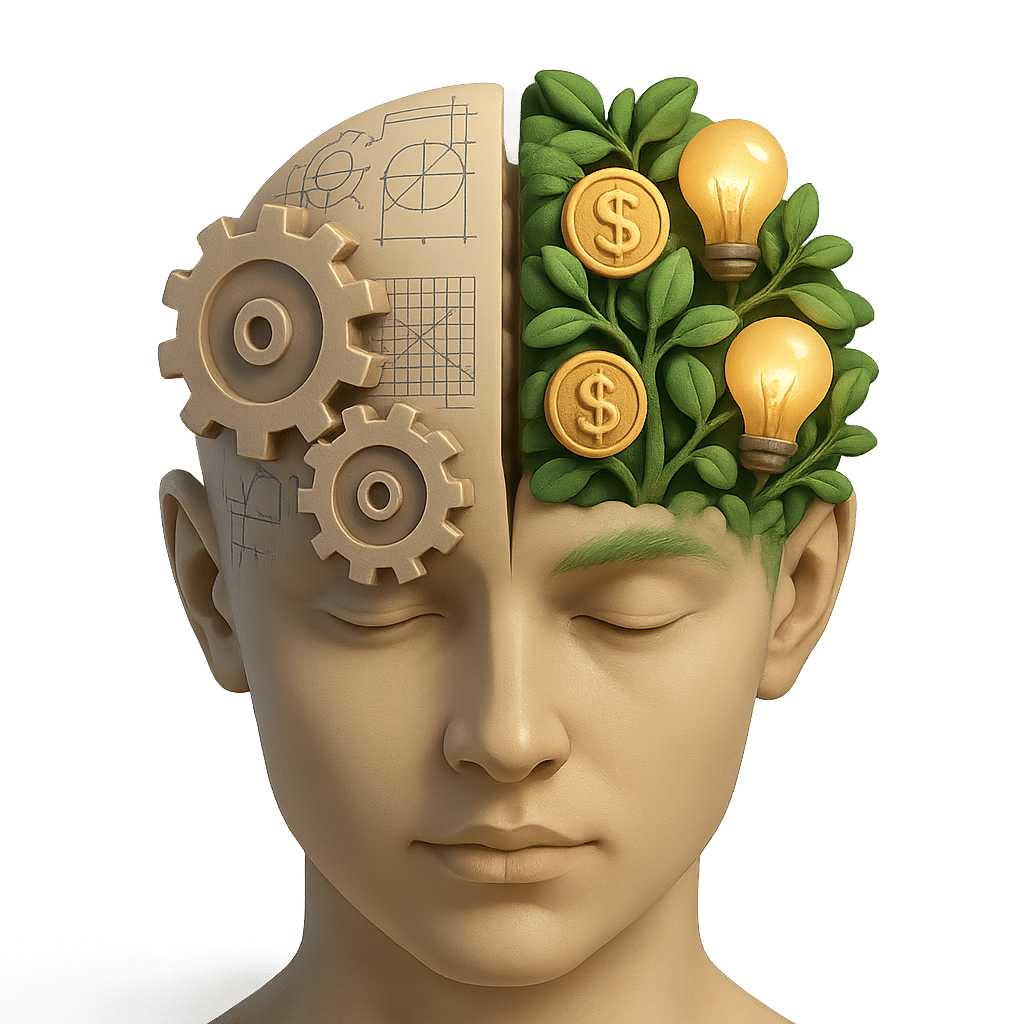 графический элемент в 3D без текста на прозрачном фоне, который визуализирует следующий текст: "Голова человека, разделенная пополам. С одной стороны мозг состоит из шестеренок и чертежей, с другой — из растущих денежных деревьев и лампочек идей. Сюрреализм, детализированный, символизм, студийный свет"