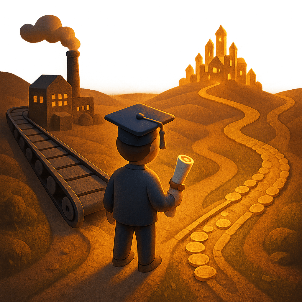 графический элемент в 3D без текста на прозрачном фоне, который визуализирует следующий текст: "Человек со свитком-дипломом в руке стоит на распутье двух дорог. Одна дорога — это конвейерная лента, ведущая на завод. Вторая дорога — это тропинка, которую он строит сам из золотых монет, ведущая к яркому городу на холме. Фэнтези, эпичный свет, символиз"