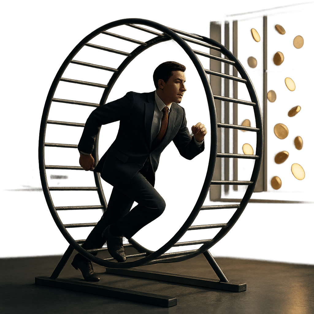 графический элемент в 3D без текста на прозрачном фоне, который визуализирует следующий текст: "Человек в деловом костюме бежит в гигантском колесе для хомяка внутри серого офиса, за окном видны падающие золотые монеты. Концепт-арт, кинематографический свет, метафора, глубокий фокус"