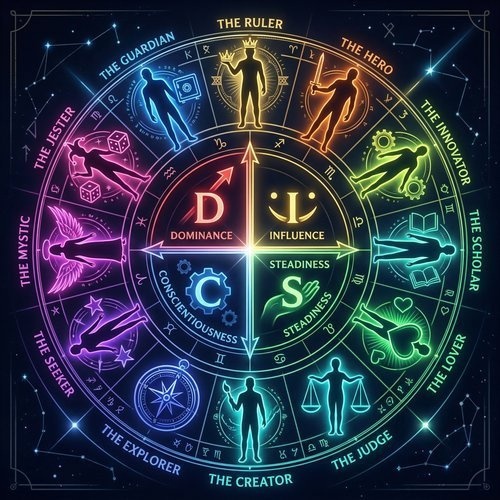 Промпт 1: Абстрактная инфографика, двенадцать архетипических человеческих силуэтов расположены в круге, каждый силуэт светится своим цветом и окружён символами своей мотивации: корона, меч, шестерёнка, книга, сердце, весы, кисть, компас, звезда, крылья, игральная кость, сейф. В центре круга — пересекающиеся оси, образующие четыре квадранта с надписями D I S C. Тёмный фон, неоновое свечение, стиль концептуальной визуализации данных, вид сверху, чистый минималистичный дизайн --ar 16:9 --v 6.1