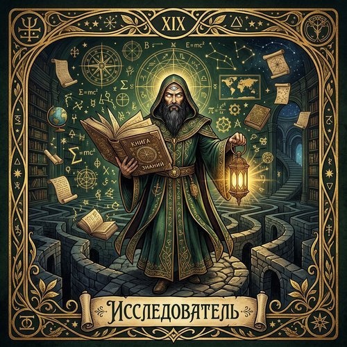 Исследователь соответствует двум арканам: II Верховная Жрица и IX Отшельник. Верховная Жрица — сидит между двумя колоннами, за завесой, со свитком на коленях. Тайное знание, интуиция, глубина. Знает — но не говорит. Видит — но не показывает. Отшельник — в аспекте поиска истины: фонарь ищет не безопасность и не деталь работы, а ответ. Стоит на вершине горы, потому что оттуда видно дальше. Общий архетип: Хранитель Знания.