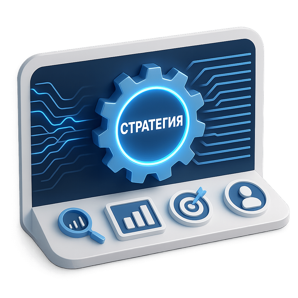 футуристический цифровой дашборд, на котором хаотичные линии данных слева превращаются в аккуратные, организованные потоки справа. В центре — большая светящаяся шестеренка с надписью "Стратегия". Вокруг иконки аналитики, графиков и целевой аудитории. Чистый, минималистичный дизайн, синяя и белая цветовая палитра, high-tech, интерфейс пользователя, инфографика --ar 16:9 --v 6.0