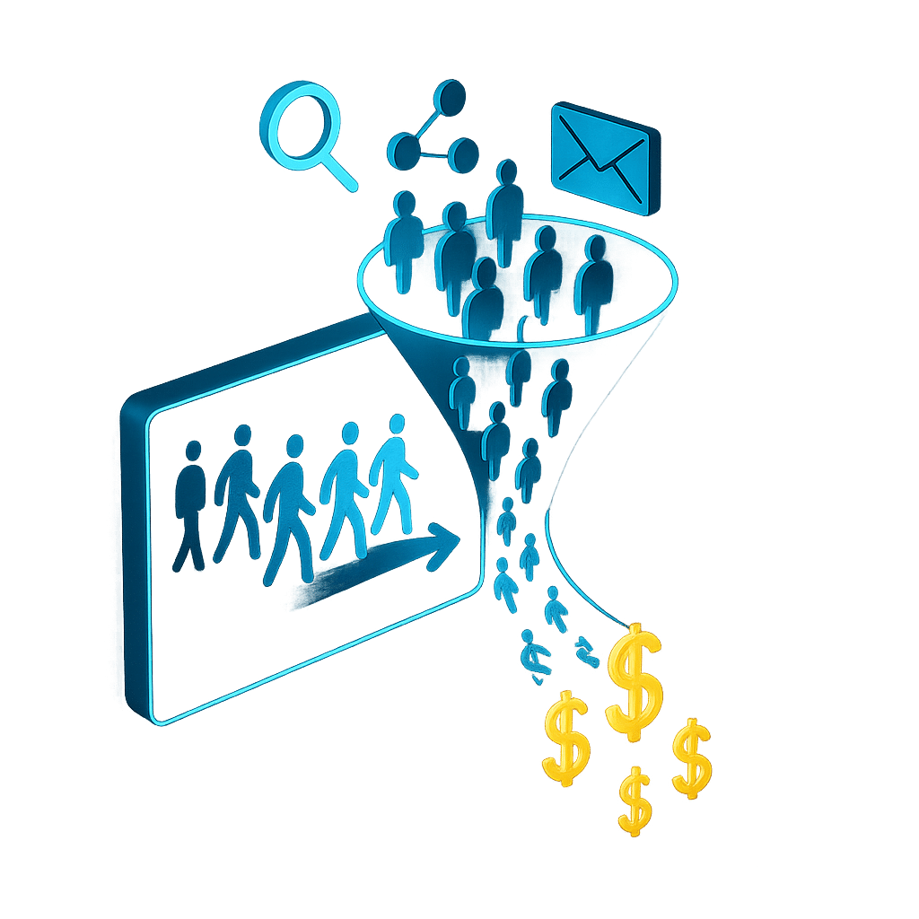 широкоформатное изображение, цифровая воронка продаж, светящаяся неоном, в которую вливается поток стилизованных людей-силуэтов, идущих из разных источников, обозначенных иконками: иконка поиска, иконка соцсетей, иконка email. На выходе из воронки появляются значки доллара. Стиль инфографики, минимализм, темный фон, высокое разрешение, кинематографичное освещение, 4K --ar 16:9 --v 6.0
