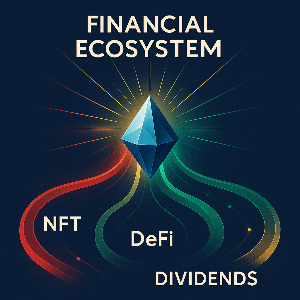 Стилизованная визуализация финансовой экосистемы. В центре элегантный кристаллический объект, который притягивает к себе потоки света и энергии. Потоки символизируют разные продукты: NFT, DeFi, дивиденды. Стиль — чистая инфографика, элегантный дизайн. Цветовая палитра: глубокий синий, насыщенный красный, изумрудный зеленый и блестящее золото. --ar 16:9