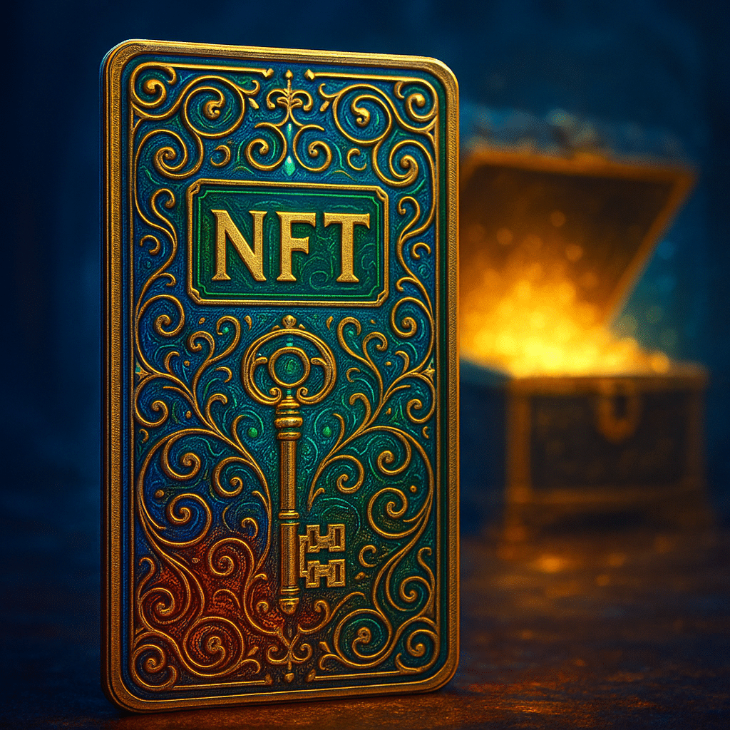 Крупный план богато украшенной цифровой ключ-карты, символизирующей статусный NFT. Карта светится изнутри и украшена сложными узорами. На заднем плане — размытое изображение открывающейся сокровищницы, символизирующей доступ к доходу. Использование синих, красных, зеленых и золотых цветов в деталях ключа и фоновом свечении. --ar 16:9