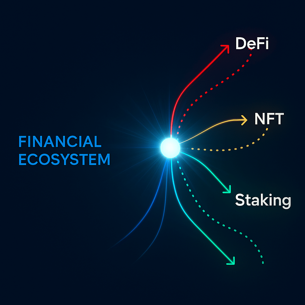 Абстрактная визуализация финансовой экосистемы. В центре светящийся узел, от которого исходят потоки данных и энергии, символизирующие разные продукты: DeFi, NFT, ставки. Стиль чистый, современный, инфографика. Цветовая палитра: синие, красные, зеленые и золотые цвета