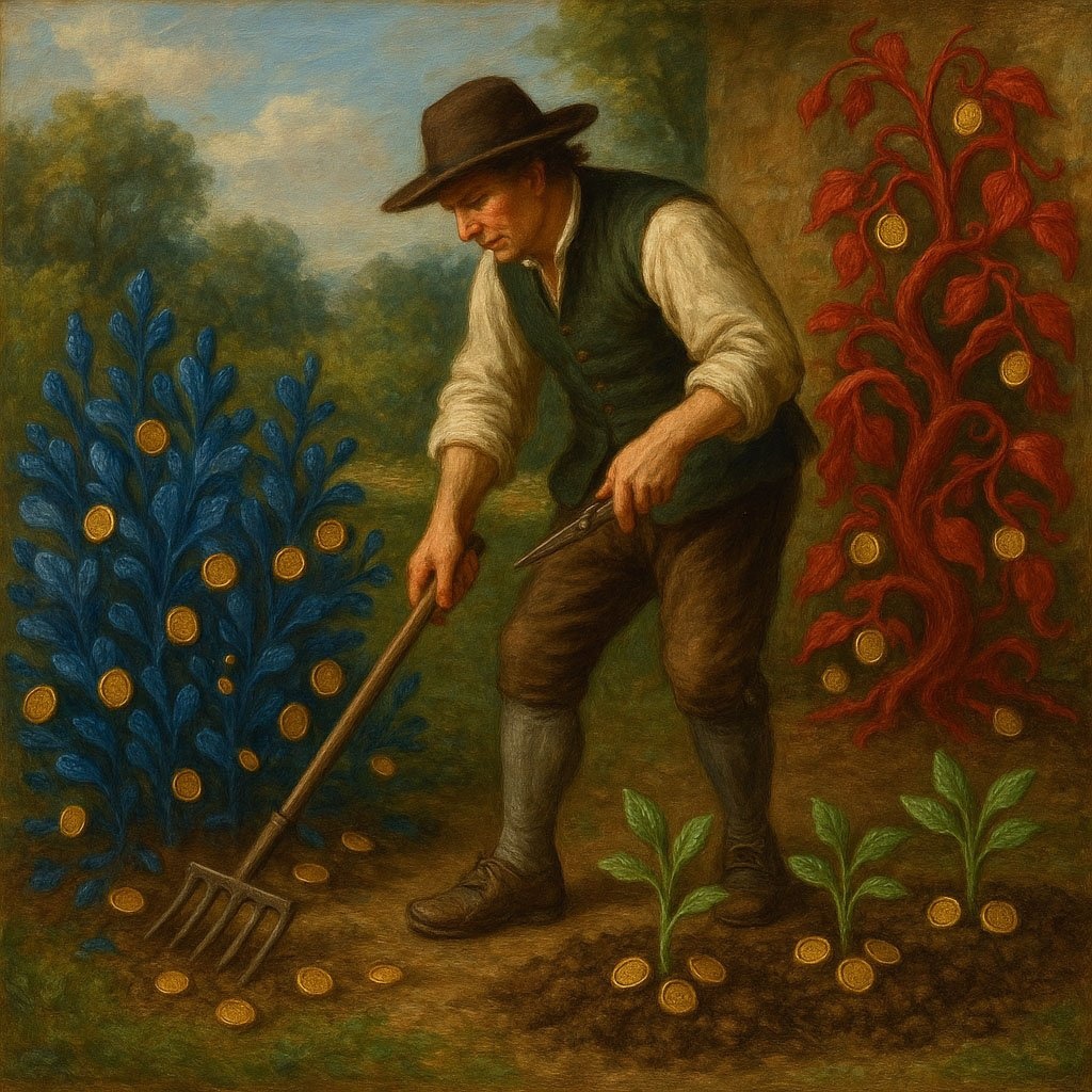 Промт для Midjourney: Садовник в классической одежде тщательно ухаживает за тремя разными участками своего сада. На одном участке растут крепкие синие растения, на другом — вьющиеся красные лианы, а на третьем из зеленой плодородной земли прорастают ростки. Все растения приносят плоды в виде маленьких золотых монет. Стиль классической живописи, масляные краски, детализированный, мягкий естественный свет, синие, красные, зеленые и золотые цвета. --ar 16:9