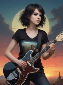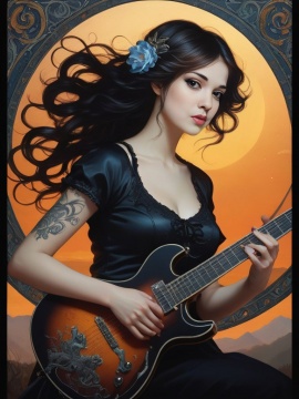 guitarist, art nouveau, realism postcard, day and night, diptych, cold and hot, mannerism, cinematic, dreamy, romantic, close macro portrait, fairytale, hyperrealistic, hyperbolized, gothic surrealism, close up gracious black-haired girl, smoky eyes, electric guitar, sunset, black t-shirt, jeans, tattoos, thorns, dark and ethereal element, moonlight, dynamic pose, tiny sparks, intricated lighting, windy, looking at camera, detailed landscape, by mucha, kuindzhi, ray caesar, expressive eyes, detailed face, light on face, shadow play, epic dynamic poster, hyperrealistic skin texture, otherworldly glowing eyes, smoke, detailed textures, cute, adorable, vintage, art on a cracked paper, fairytale, patchwork, storybook detailed illustration, cinematic, ultra highly detailed, tiny details, beautiful details, mystical, luminism, vibrant colors, complex background